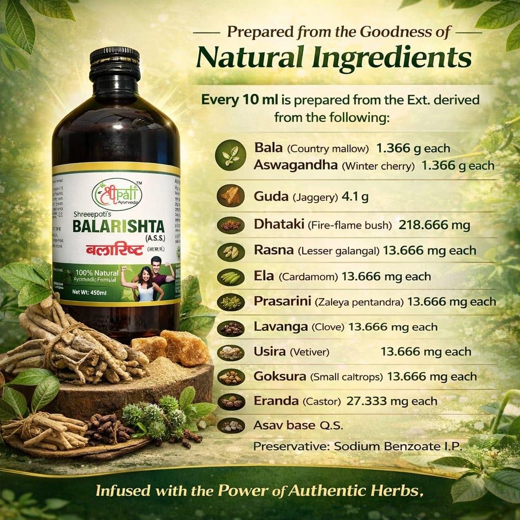 Shreepati Ayurveda Balarishta (A.S.S.) is a classical Ayurvedic formulation designed to improve strength, energy, and overall vitality. Enriched with powerful herbs like Bala and Ashwagandha, this tonic helps support the nervous system, boosts immunity, and enhances physical endurance.